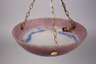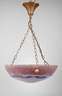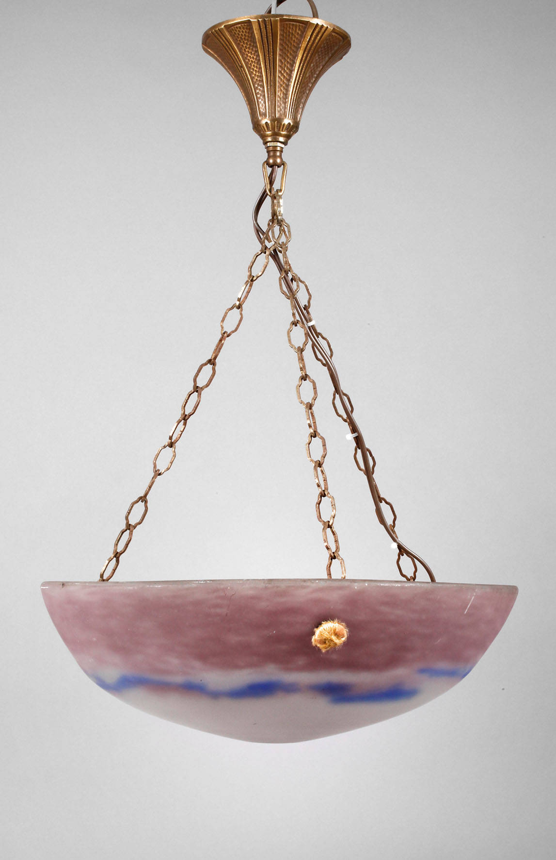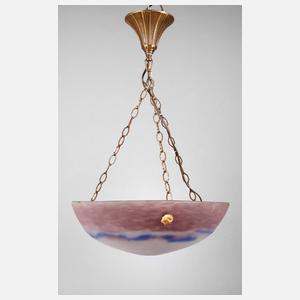 um 1920, ätzsigniert L.V. ... Mare, an Bronzemontierung sowie an drei Gliederketten abgehängte Schale aus satiniertem Klarglas, mit Pulvereinschmelzungen in Violett und blau, einflammig elektrifiziert, min. Altersspuren, H 55 cm, D 35 cm.
