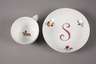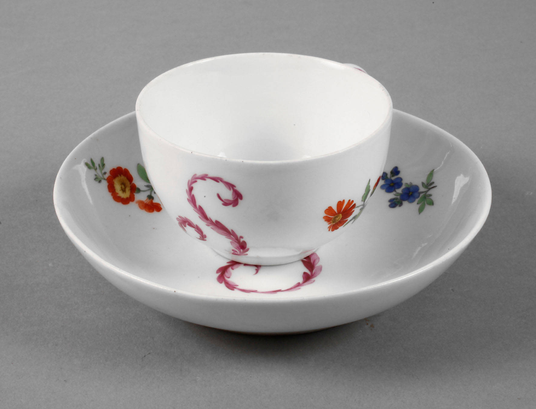 1. Hälfte 19. Jh. blaue Zeptermarke, polychrome Aufglasurbemalung, Buchstabe ”S” und Streublümchendekor, die Tasse mit verschlungenem Asthenkel, guter, altersgemäßer Zustand, H 6 cm.