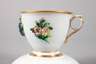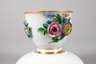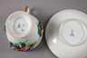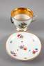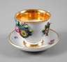 blaue Schwertermarke Schmierzeit Mitte 19. Jh., in Grün gepinselte Nr. 31., korallrote Malermarke M., aufgemodelte und polychrom bemalte Blumensträuße, partielle Vergoldung, diese etwas berieben, die Untertasse um 1900 ergänzt, Insektenmalerei mit Blümchen und goldener Zähnchenkante, H zusammen 8 cm.