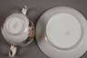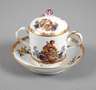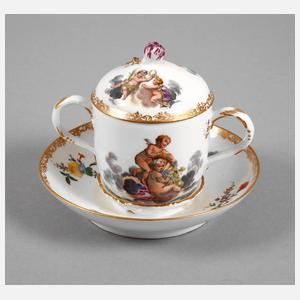 Punktzeit um 1763–1780, feine polychrome Aufglasurbemalung und Vergoldung, bemalt mit Engeln auf Wolken als Allegorien, mit Blüten und Trauben, auf der Untertasse Blütenbuketts, goldene Ornamentbänder am Deckel und an der Untertasse, Tasse mit einer winzigen Beschädigung am Stand, sonst sehr guter Zustand. H ca. 11,5 cm.