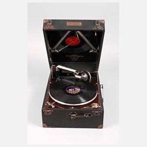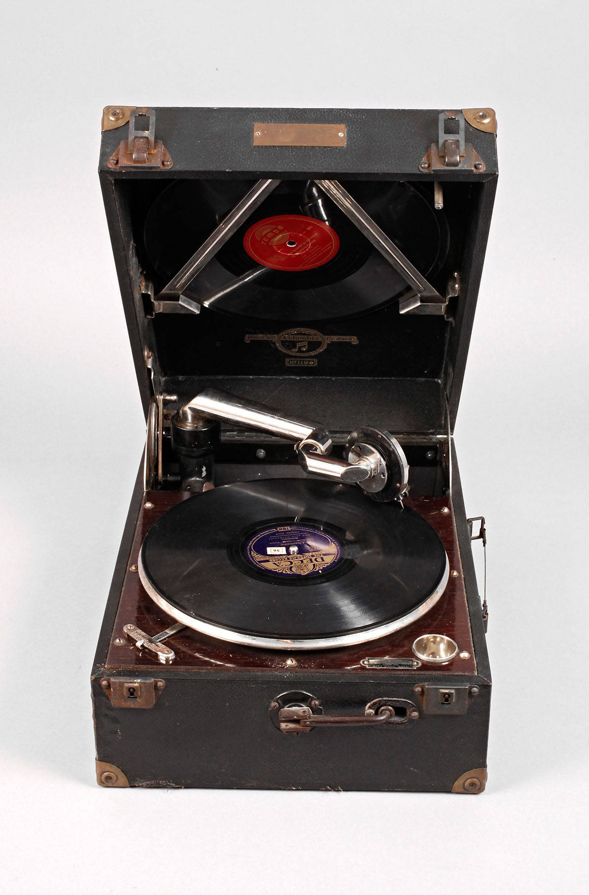 1930er Jahre, gemarkt Columbia sowie bezeichnet Vivatonal Grafonola Nr. 1120, weiteres Etikett Sydney Scarborough Hull, gravierte Messingplakette mit Dedikation am Gehäuse, dieses aus lederummanteltem Holz mit verchromten Metallteilen, klappbare Kurbel, beigegeben sechs Platten, funktionstüchtig, Alters- und Gebrauchsspuren, Maße 16 x 30 x 41 cm.