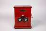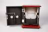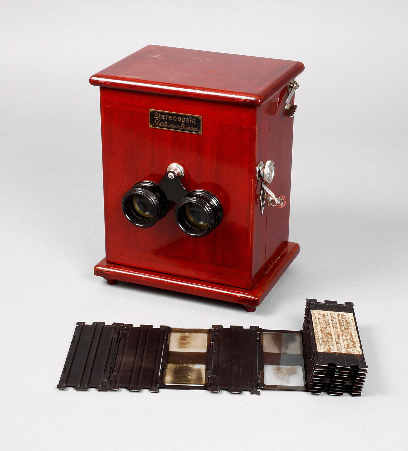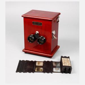 um 1910, Front mit originalem Messingetikett, Mahagonigehäuse, bakelitummantelte Linsen, verchromte Metallteile, Innenleben geschwärzt, beigegeben Weißblechhülsen mit passenden Glasdias, funktionstüchtig, mit Schlüssel, Oberfläche mit leichten Gebrauchsspuren, im originalen Transportkarton, Maße 25 x 19 x 15 cm.