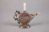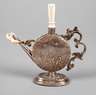 wohl Hanau, um 1880, Augsburger Phantasiepunzen, Silber geprüft, in Form eines Kännchens, beidseitig Figuren in Landschaft, Rocaillenhenkel mit Blattwerk, Ausguss mit einer anmontierten Hundefigur aus Elfenbein geschnitzt, herausnehmbarer Griff mit Metallstab, Hündchen nicht ganz komplett, H 8 cm, G ca. 91 g.