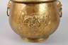 um 1890, Messing getrieben, schauseitig eine reliefierte Darstellung einer Bauernstube mit Zechgelage, seitlich Löwenköpfe mit beweglichen Ösenhenkeln, stärkere Gebrauchs- und Altersspuren, H 24 cm, D innen oben 23 cm.