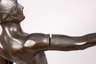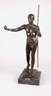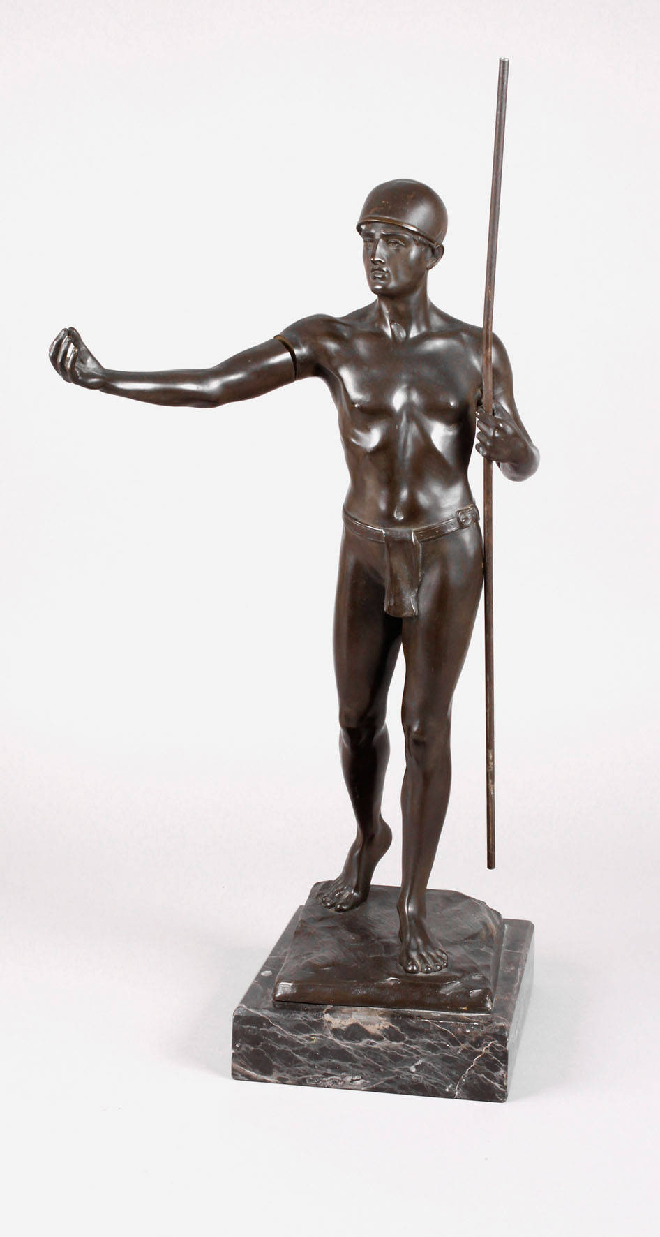 um 1900, unsigniert, Bronze dunkel patiniert, Darstellung eines Kriegers als Halbakt mit Speer, Helm und Lendengurt, in ausdrucksstarker Pose, auf naturalistisch gestalteter, rechteckiger Plinthe, auf dunklem Marmorsockel, am Helm berieben, ein Arm lose, H Bronze ca. 62 cm, H gesamt ca. 67 cm.