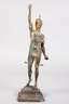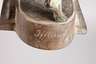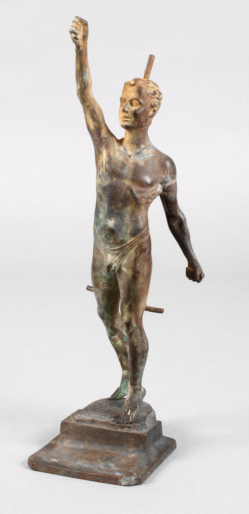 datiert 1993, verso signiert Iffland, Bronze mit Alterspatina und Gussrückständen, Gussmodell mit Resten des Angusssystems und unverputzten Gussnähten, Aktdarstellung eines Siegers mit nach oben gerecktem Arm, auf asymmetrischer, getreppter Plinthe, H gesamt ca. 36,5 cm. Künstlerinfo: Bildhauer in Berlin (1862–1935), war mit Portraitbüsten und Genrefiguren oft auf Berliner Ausstellungen vertreten (mehrere Akademieausstellungen, internationale Ausstellung 1891 und Große Kunstausstellung 1893), beteiligte sich 1886 ohne Erfolg an der Konkurrenz um das Berliner Lessingdenkmal. Quelle: Thieme-Becker.