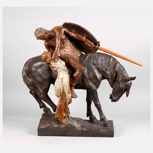 um 1910, signiert, Manufakturmarke Fritz Kochendörfer, geritzte Nummer P 81008, weitere geprägte Nummern, Keramik polychrom bemalt, Opernszene aus Richard Wagners Oper ”Die Nibelungen”, Darstellung der Verliebten Siegfried und Brünhild beim Abschied, Brünhild überlässt ihm ihr Ross ”Grane” und sendet ihn ”zu neuen Taten teurer Helde”, nachdem sie sich ewige Liebe und Treue geschworen haben, fachgerecht restauriert, sonst gut erhalten, H ca. 79 cm, L ca. 88 cm. Künstlerinfo: österreichischer Bildhauer, tätig 1885–1915. Quelle: Internet.