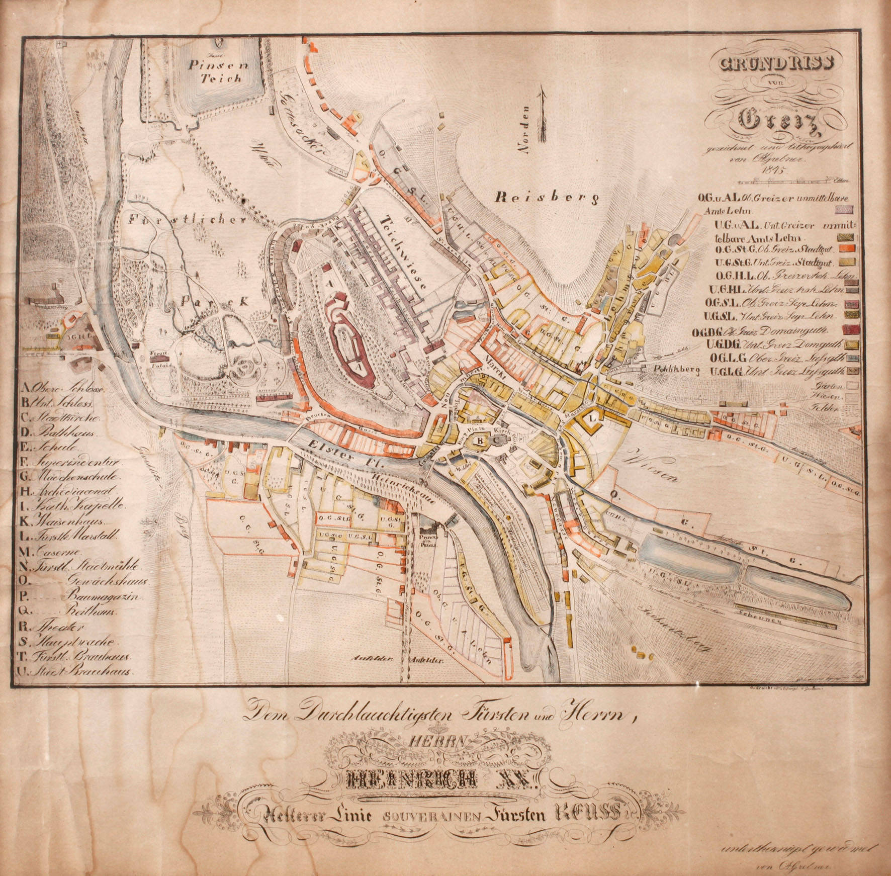 zeigt ein Gebiet zwischen der Insel im Plinsenteich und den Teichen am Aubach, mit dem Neumarkt und dem Oberen Schloss im Zentrum, zwei Legenden, ein Maßstab, teilkolorierte Lithografie, bezeichnet ”Grundriss von Greiz”, signiert ”gezeichnet und lithographiert von CAGrebner” (Carl Alexander Grebner), alter Wasserschaden, leicht knittrig, befriedigendes Exemplar, gerahmt, Darstellungsmaß ca. 26,5 x 34 cm.