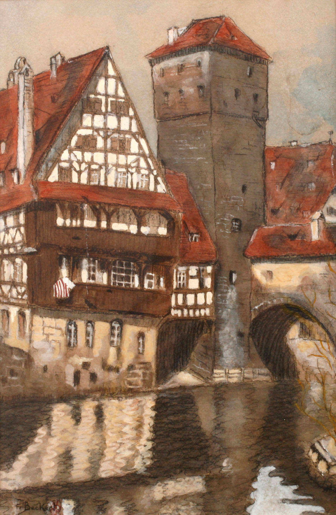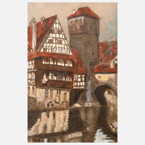 Altstadtansicht, mit Blick über die Pegnitz, auf das Weinstadel und den Wasserturm am Henkerssteg, Mischtechnik (Gouache und Aquarell über Kohlezeichnung), um 1910, links unten signiert ”F. Beckert”, hinter Glas gerahmt, Falzmaße ca. 50 x 34 cm. Künstlerinfo: eigentlich Karl Friedrich Beckert, dt. Architektur- und Landschaftsmaler (1877 Leipzig bis 1962 Dresden), Schulbesuch in Plauen, 1894–96 Studium an der Akademie für Graphische Künste Leipzig, 1896–1900 Weiterbildung an der Dresdner Akademie bei Friedrich Preller dem Jüngeren, Meisterschüler von Gotthard Kuehl, Abschluss der Akademie mit Goldmedaille, 1902 Gründung der Künstlergruppe ”Die Elbier”, die 1909 in der ”Dresdner Sezession” aufging, ab 1901 regelmäßige Sommeraufenthalte in Franken, Studienreisen durch Bayern, Österreich und Italien, 1905 Versuch der Gründung einer Malerkolonie mit Rudolf Poeschmann und R. Müller-Ehrenberg in Kirchberg/Jagst, seit 1908 Privatdozent und 1925–45 Professor für Architekturmalerei und -zeichnen an der TU Dresden, beschickte 1942–44 die Große Deutsche Kunstausstellung im Haus der Deutschen Kunst München, 1945 Verlust des Ateliers und eines Großteils seines Lebenswerkes bei der Zerstörung von Dresden, Mitglied des Dresdner Denkmalrates, Quelle: Thieme-Becker, Vollmer, Dressler, Wikipedia und AKL.