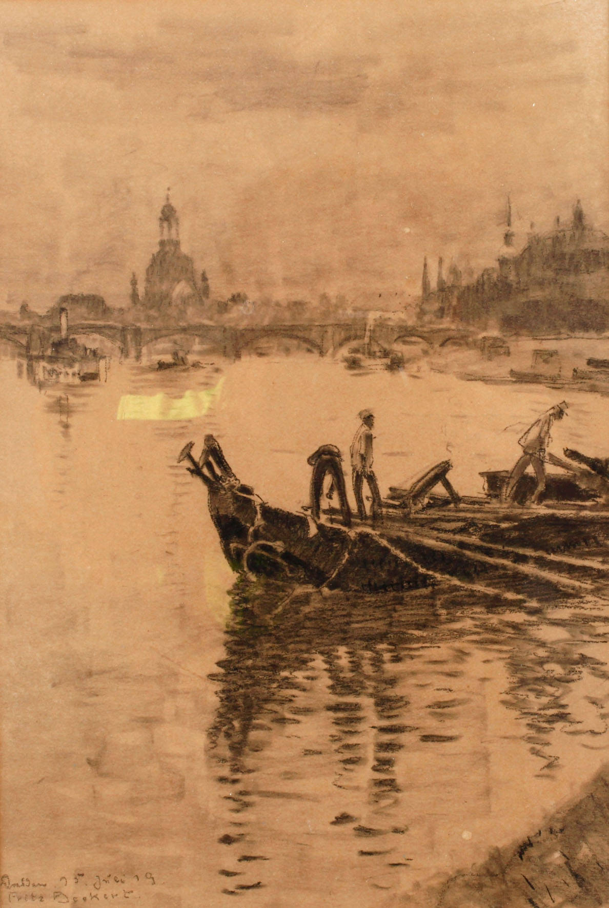 Blick vom Altstädter Ufer auf die Elbe, mit Augustusbrücke und der Altstadtsilhouette, mit Frauenkirche, Sophienkirche, Schloss und Semperoper, skizzenhafte Mischtechnik (Bleistift und Kohle), links unten ortsbezeichnet, datiert und signiert ”Dresden, 15. Juli (19)19 Fritz Beckert”, Blatt gebräunt, hinter Glas und Passepartout gerahmt, Passepartoutausschnitt ca. 31,5 x 21,5 cm, dazu Exemplar der ”Zwinger-Bücher“ aus dem Verlag der Kunst Dresden ”Aus den Skizzenbüchern eines Malers – Fritz Beckert” mit einer Einleitung von Erhard Frommholt und Abbildungen von Skizzen und ähnlichen Arbeiten wie dem vorliegenden Blatt (stärkere Gebrauchsspuren). Künstlerinfo: eigentlich Karl Friedrich Beckert, dt. Architektur- und Landschaftsmaler (1877 Leipzig bis 1962 Dresden), Schulbesuch in Plauen, 1894–96 Studium an der Akademie für Graphische Künste Leipzig, 1896–1900 Weiterbildung an der Dresdner Akademie bei Friedrich Preller dem Jüngeren, Meisterschüler von Gotthard Kuehl, Abschluss der Akademie mit Goldmedaille, 1902 Gründung der Künstlergruppe ”Die Elbier”, die 1909 in der ”Dresdner Sezession” aufging, ab 1901 regelmäßige Sommeraufenthalte in Franken, Studienreisen durch Bayern, Österreich und Italien, 1905 Versuch der Gründung einer Malerkolonie mit Rudolf Poeschmann und R. Müller-Ehrenberg in Kirchberg/Jagst, seit 1908 Privatdozent und 1925–45 Professor für Architekturmalerei und -zeichnen an der TU Dresden, beschickte 1942–44 die Große Deutsche Kunstausstellung im Haus der Deutschen Kunst München, 1945 Verlust des Ateliers und eines Großteils seines Lebenswerkes bei der Zerstörung von Dresden, Mitglied des Dresdner Denkmalrates, Quelle: Thieme-Becker, Vollmer, Dressler, Wikipedia und AKL.