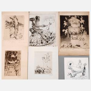 dabei Neujahrsgraphiken auf 1928, 1929, 1930, 1931 und 1932, Radierungen, je unter der Platte in Blei handsigniert und teils mit persönlichen Wünschen versehen, weiterhin gezeichnete Neujahrskarte auf 1944, unterschiedliche Formate, teils stärkere Erhaltungsmängel, ungerahmt, Blattmaß max. 33 x 25,5 cm. Künstlerinfo: eigentlich Georg Oskar Erler, dt. Maler, Zeichner, Graphiker, Karikaturist und Radierer (1871 Dresden bis 1950 Ainring bei Bad Reichenhall), studierte 1891-94 an der Kunstgewerbeschule Dresden, 1894-98 an der Dresdener Akademie bei Gotthardt Kuehl und Hugo Bürkner, 1897 einige Monate in Paris anschließend 1 Jahr in München und in Rom, ab 1902 in Dresden tätig, schuf nach 1900 zahlreiche Karikaturen, die ihn rasch bekannt machten, 1902 zusammen mit Kuehl, Ferdinand Dorsch und Fritz Beckert Gründungsmitglied der Künstlergruppe „Die Elbier“, 1913-37 Professor an der Kunstgewerbeschule Dresden, 1945 Verlust seines Ateliers und Großteil seines Lebenswerkes durch Bombenangriff auf Dresden, Übersiedlung nach Ainring in Oberbayern, Quelle: Thieme-Becker, Vollmer, Dressler und Internet.