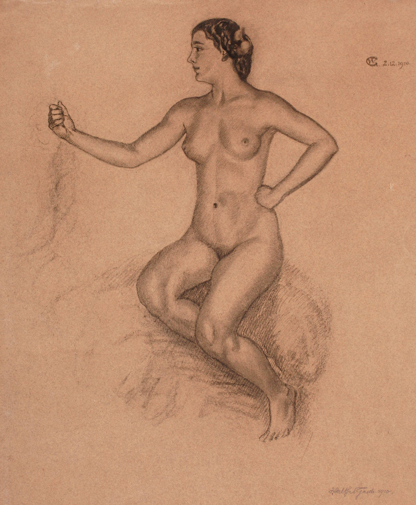 junge sitzende Frau, in heroischer Pose, akademische Schülerarbeit aus Gaschs Akademiezeit in Dresden, Kohlezeichnung auf getöntem Papier, rechts oben monongrammiert und datiert ”WG 2. 12.1910” und rechts unten signiert und datiert ”Walther Gasch 1910”, rückseitig Teilstudie eines Männerakts, geblichen und geringe Alters- bzw. Atelierspuren, ungerahmt, Blattmaße ca. 54 x 46 cm. Künstlerinfo: auch Walter Gasch, dt. Maler, Zeichner, Graphiker, Restaurator, Autor und NS-Funktionär (1886 Leipzig bis ca. 1962 Nentershausen-Dens bei Bebra), studierte ab 1905 an der Akademie Dresden bei Emanuel Hegenbarth und Oskar Zwintscher, hier Meisterschüler bei Gotthardt Kuehl und später bei Richard Müller, unternahm Studienreisen nach Holland, Frankreich und Italien, ab 1929 Assistent lür Licht- und Tiefdruck an der Hochschule für Graphik und Buchkunst Leipzig tätig, als sächsischer Gaufachgruppenleiter der Bildenden Künste der NSDAP ab 1933 maßgeblicher Initiator der restriktiven NS-Kulturpolitik in Dresden, Mitglied der Dresdner Kunstgenossenschaft, Vorstandsmitglied im Reichsverband Bildender Künstler Deutschlands und Mitglied des ”Deutschen Künstlerverbandes Dresden”, beschickte 1939 die große Deutsche Kunstausstellung im Haus der Deutschen Kunst München, tätig in Dresden, Quelle: Vollmer, Dressler, Schülerlisten der Dresdener Akademie und Tsu?erman ”Geschichte und bildende Kunst – Jahrbuch 2006 für Deutsche Geschichte”.