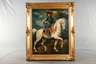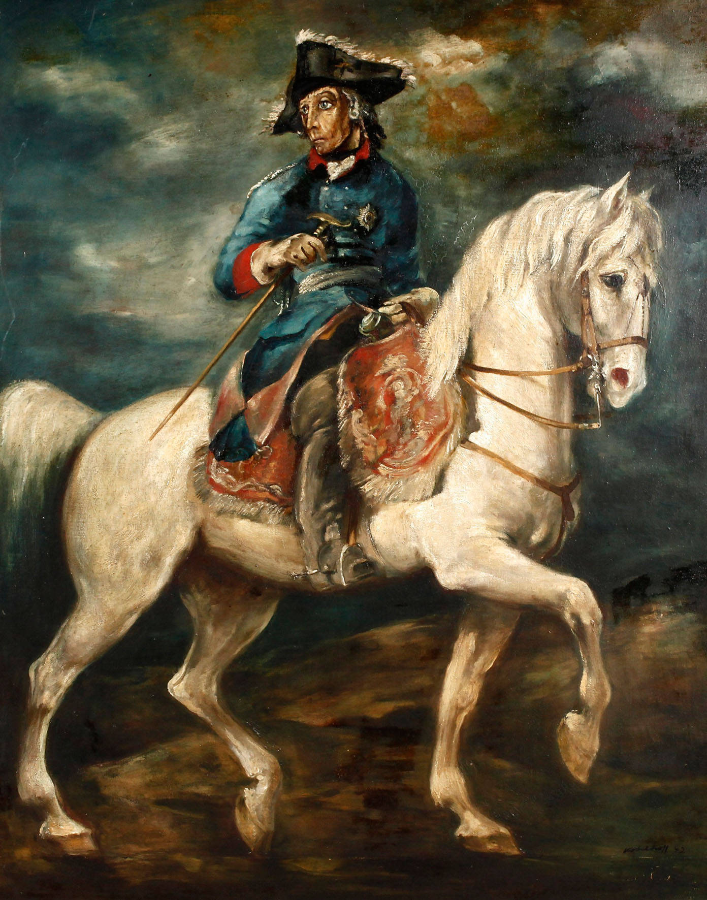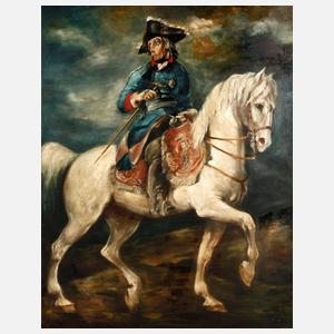 Darstellung des Schauspielers Otto Gebühr (1877-1954) hoch zu Ross in seiner über 22 Jahre (1920-42) verkörperten Paraderolle des Preußenkönigs Friedrich der Große, minimal pastose Malerei, Öl auf Sperrholz, rechts unten signiert und datiert ”Kohlhoff (19)42”, wohl Wilhelm Kohlhoff (1893-1971), gering frühschwundrissig, Craquelure, etwas reinigungsbedürftig, im prächtigen, ca. 15 cm breiten Goldstuckrahmen um 1870 mit Eck- und Mittelkartuschen (restaurierungsbedürftig) gerahmt, Falzmaße ca. 110 x 96,5 cm.