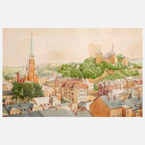 Dächerblick von jenseits der Göltzsch, zur Mylauer Stadtkirche und Burgberg, aquarellierte Zeichnung, undatiert, 1. Hälfte 20. Jh., unten links bezeichnet und signiert ”Mylau i. V. ELudwig”, geringe Altersspuren, hinter Glas gerahmt, Darstellungsmaß ca. 13 x 20 cm. Künstlerinfo: dt. Lithograph (1889 Netzschkau bis 1958 Reichenbach im Vogtland), Kindheit in Cunsdorf, Lehre zum Lithograph, 1907–09 als Lithograph in Mannheim, anschließend als Lithograph und nach 1918 als technischer Betriebsleiter bei Schmidt & Artinger in Reichenbach tätig, 1914–18 Kriegsdienst im 1. Weltkrieg, Quelle: Neuberin-Museum Reichenbach und Einwohnerbuch der Städte Reichenbach i. Vogtl., Mylau, Netzschkau, Lengenfeld, Treuen 1924.