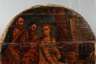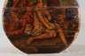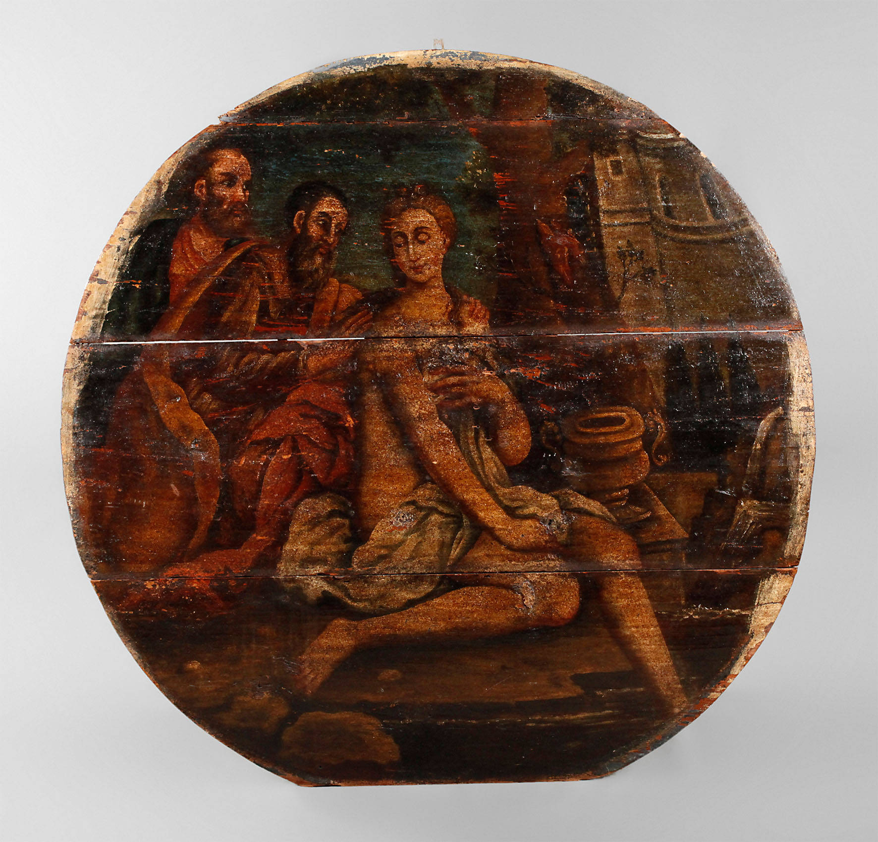 auch ”Susanna und die beiden Ältesten”, apokryphe Erzählung des Buches Daniel der hebräischen Bibel, welche schließlich im Alten Testament der katholischen Bibel Aufnahme fand, die Geschichte berichtet von der schönen jungen Babylonierin Susanna, Ehefrau des reichen Jojakim, in deren Haus auch zwei alte Richter verkehrten, welche der schönen Frau verfallen waren und die eine Abwesenheit Jojakims dazu nutzten, um Susanna sexuell zu begehren, die junge Frau wehrte sich und wurde aus Rache dafür von den Richtern des Ehebruchs beschuldigt - woraufhin Susanna zum Tode verurteilt wurde, jedoch durch eine erneute Zeugenbefragung Daniels auf göttliche Eingebung hin, konnte unmittelbar vor Vollstreckung des Urteils die Unschuld der Verurteilten erkannt werden und die Verleumder wurden gerichtet, die Darstellung religiös oder mythologisch verbrämter Frauenakte war auch in der Zeit des Barock gängiger Vorwand der Darstellung weiblicher Nacktheit und Ausdruck erotischer Gelüste, Tondo, Öl auf vier zu runder Maltafel zusammengesetzter, grob bearbeitete Holzbretter, welche später mit Eisenbändern zusammen gefügt wurden, wohl Italien, 18. Jh., unsigniert, mit farbigem Firnis patiniert, Maltafel instabil, Erhaltungsmängel, ungerahmt, Durchmesser ca. 119 cm.