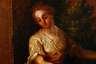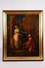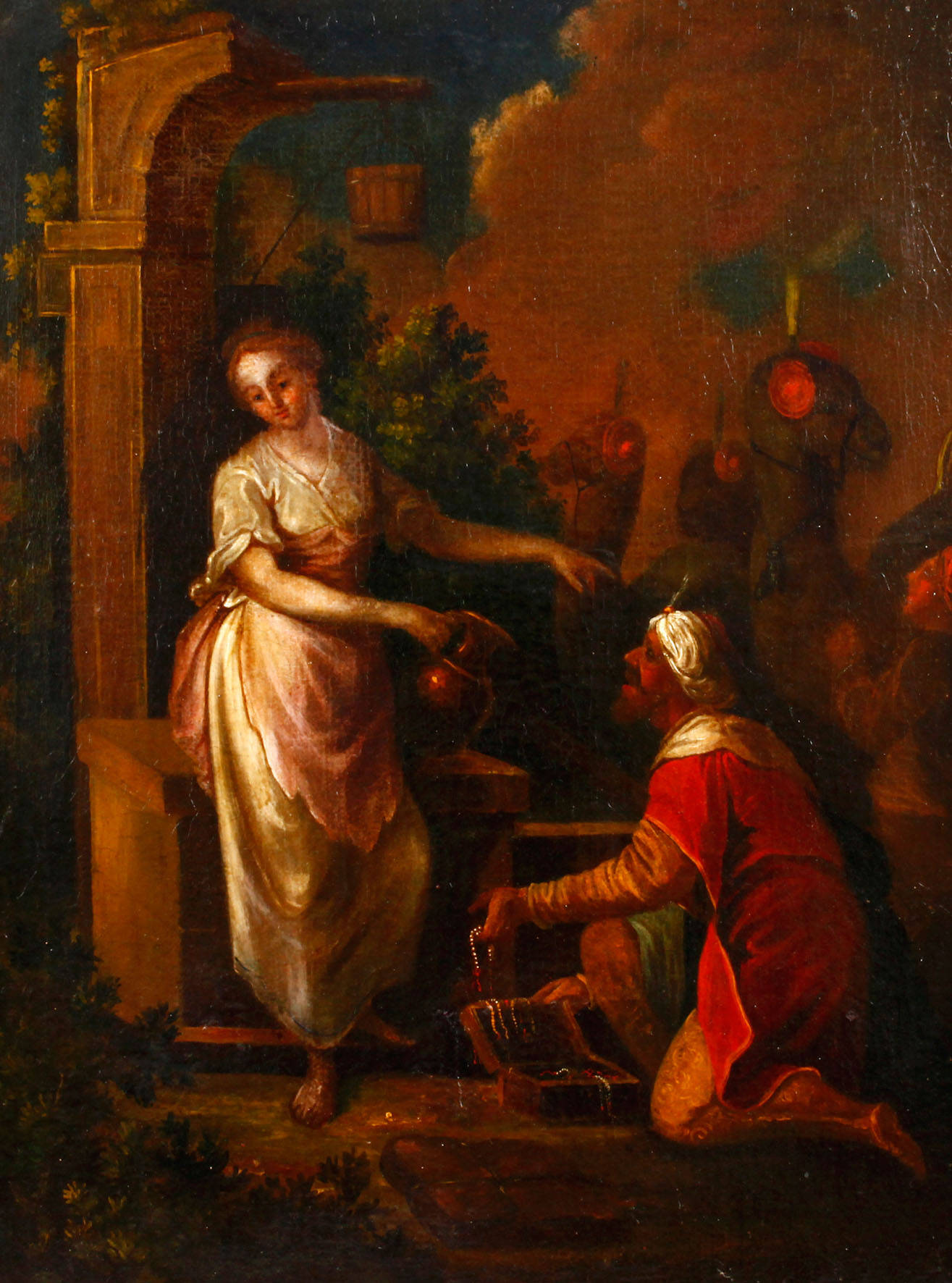 Abrahams Diener Elieser wurde ausgeschickt, eine Frau für Isaak zu suchen, am Wasserbrunnen vor der Stadt Nahor bat er Gott um ein Zeichen: Die zukünftige Braut solle ihm und seinen Kamelen Wasser schöpfen..., Darstellung wohl italienische/alpenländische Schule des 18. Jh., Öl auf Leinwand, unsigniert, Alterscraquelé, doubliert, in neuer gold-brauner gekehlter Leiste gerahmt, Falzmaß 58 x 44,5 cm.