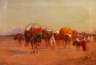 langsam zieht eine Karawane durch den Wüstenstaub, ihre bunten Kleider und Tücher stehen im heftigen Kontrast zur lebensfeindlichen Umgebung, Öl auf Leinwand, unten links signiert und datiert ”A. Delahogue 1912”, doubliert, gering retuschiert, Altersspuren, ungerahmt, Maße ca. 36 x 52,5 cm. Künstlerinfo: franz. Maler und Aquarellist (1867 Soissons/Aisne bis 1953 ?), reiste zusammen mit seinem Bruder Eugène durch Nordafrika, unbefristetes Mitglied der französischen Künstlergesellschaft, beschickte regelmäßig deren Ausstellungen, bekannt für seine orientalistischen Werke, Quelle: Bénézit und Internet.