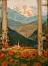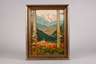 Blick durch ein Blumenspalier auf das Tafelgebirge der ”Reiteralpe” in den Berchtesgadener Alpen, am Fuß der Berge ist Inzell mit seiner St.-Michael-Kirche zu sehen, flüchtige Ölmalerei auf Holzplatte, diese bildet zugleich den partiell in die Malerei eingebundenen Malgrund, rückseitig unleserlich signiert und datiert 1954, reinigungsbedürftig, leichte Erhaltungsmängel, gerahmt, Falzmaß ca. 46 x 34 cm.