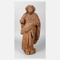 wohl um 1600, Holz geschnitzt, mit natürlich gewachsener Patina, halbplastische weibliche Gestalt als Standfigur im langen Gewand, in fragmentarischer Erhaltung, H 64 cm.