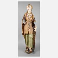19. Jh., Holz geschnitzt, kreidegrundiert, farbig gefasst und partiell vergoldet, halbplastisch gearbeitete Gestalt der Märtyrerin im lang fließenden Gewand, auf kleiner runder Plinthe, mit dem linken Arm stützt sie sich an einen kleinen Turm, dessen Front ein reliefierter Hostienkelch schmückt, die Hand des rechten Armes fehlt, originale Farbfassung Ende des 19. Jahrhundert komplett übergangen, Bekrönung fehlt, ein Fuß alt repariert, inaktiver Holzwurmbefall, Erhaltungsmängel, H 120 cm.