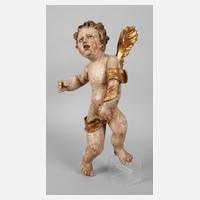 18. Jh., Holz geschnitzt, gestuckt und farbig gefasst sowie partiell vergoldet, vollplastisch gearbeiteter Cherub im Fluge mit entrücktem Blick, oberflächliche Substanzverluste, rest.bed., L 66 cm.