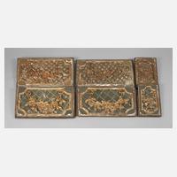 Ende 18. Jh., vermutlich aus einer Wandvertäfelung, Eichenholzbretter geschnitzt, gestuckt, farbig gefasst und vergoldet, verschieden große Reliefs verziert von Gitterwerk und Floralelementen, Substanzverluste, Maße 42 x 28 cm bzw. 27 x 15 cm.