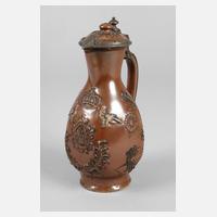 um 1690, graues Steinzeug handabgedreht, braune Lehmglasur farbig staffiert, vorderseitig abgeflacht, darauf das Chursächsische Wappen mit Krone und zwei Vögeln, seitlich große Wiesenblumen, das Wappen im offenen Kranz, gesamter Dekor aufgemodelt, zinngefasster Deckel mit Zähnchenkante, verstärkter Schnaupe und kleinem Kugeldrücker, gerippte Zinnauflage auch am Henkel, sehr selten, im guten altersgemäßen Zustand, H 20 cm. Quelle: Von den Anfängen der Bunzlauer Keramik, Autorenkollektiv, Seite 256; ein ähnliches Kännchen besitzt das Museum Slaskie in Wroclaw.