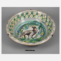 wohl um 1600, schräge Wandung, der Boden leicht gewölbt, abgeschrägte eingerollte Oberkante, über die gesamte Oberfläche Abdrehrillen, helle graugrüne Zinnglasur, mittig in Mangan und Braun ein stilisierter heulender Wolf in Wiesenlandschaft, diese oxidgrün und blau gestaltet, auf der Wandung umlaufende bunte Wellenbänder, im ganzen antimongelb akzentuiert, mit einer Eisenmontur zum Aufhängen versehen, Haarrisse, alt mit Eisenklammern fixiert, Glasurabplatzer und ein Ausbruch an der Kante, H 14,5 cm, D 70 cm. Info: die Farben weisen auf eine frühe Zittauer Arbeit hin, welche aber nicht belegbar ist.