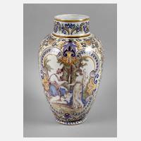 wohl Italien, Ende 19. Jh., ungedeutete Pinselmarke F.F., gepinselte Dekornummer 628/ 4, rötlicher Scherben, gelblicher und hellblauer Fond, feiner Pinseldekor in Scharffeuerfarbe, beidseitig Szene Adam und Eva, mit Engel und Apfel, am Baum der Erkenntnis, dazwischen reiche Ornamentbänder mit Muscheln und floralen Motiven, etwas Alterscraquelé, sonst guter Zustand, H 55 cm.