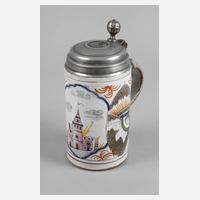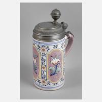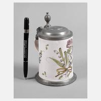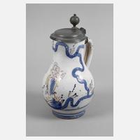 Öttingen-Schrattenhofen, 18. Jh., rötlicher Fayencescherben handabgedreht und weißlich glasiert, mit bunten Scharffeuerfarben bemalt, mittig ein Blumenstrauß mit Nelke und Schleife, seitlich kleine Blätter und weitere Zweige, Henkel mit Fischgrätenmuster, Montierung bestehend aus Zinnstandring und Deckel, dieser mit eingelegter Medaille Bavaria auf Mondsichel, Besitzermonogramme MM und SM, am Henkel ein kleiner Glasurabrieb, sonst sehr gute Erhaltung, H 15 cm.