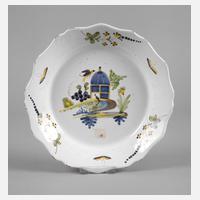 18./19. Jh., ungemarkt, leicht rötlicher Fayencescherben, weiß glasiert, mit bunten Scharffeuerfarben bemalt, im Spiegel ein Pavillon mit Vögeln in Landschaft, auf der Fahne Blütenzweige und Insektenmalerei, kleinere Fehlstellen am Rand, D 22,5 cm.