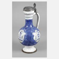 Werkstatt Thomas Obermüllner 1675–1680, hellbrauner Fayencescherben weißlich glasiert, mit Scharffeuerfarben in Blau, Mangan, Grün und Gelb bemalt, schauseitig Sakralmotiv, seitlich Hirsch und Fuchs mit Hahn, Doppelhenkel, Zinndeckel mit Meisterpunze J.S.F., innen nicht durchgehende Abplatzer sowie winzige Fehlstellen am Lippenrand und an der Wandung, insgesamt guter altersgemäßer Zustand, H 25 cm. Quelle: Hermann Langer, Österreichische Fayencen, München 1988, Seite 136 ff.