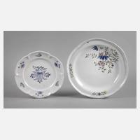 18. Jh., ungemarkt, leicht rötlicher Fayencescherben, weiß glasiert und mit Scharffeuerfarben bemalt, einer mit blütenartig gewellter Fahne und kobaltblauer Blumenmalerei, der andere mit buntem Blütenbukett und bunten Blumenranken, dieser fachgerecht, nicht sichtbar, restauriert, der andere haarrissig, D 24,5 und 30,5 cm.