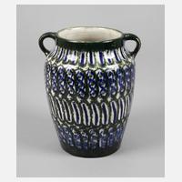 1930er Jahre, Prägemarke, cremefarbenes Steinzeug handabgedreht, geschwämmelter Dekor in dunklem Grün, Kobaltblau und Braun, am Hals eine winzigste Fehlstellung, sonst guter Zustand, H 22 cm.