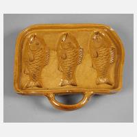 19. Jh., Irdenware mit gelblich brauner Glasur, drei Fischvertiefungen in gehenkelter Schale, brandrissig, zwei Füße fehlen, L 27 cm.