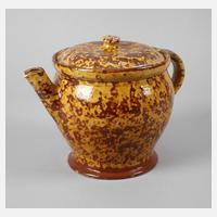 Mitte 19. Jh., am Henkel gemarkt Bayerische Ostmarkt Töpferei Thurnau, handabgedrehtes Steinzeug, gelb glasiert und braun marmoriert, bauchig, mit schlanker Ausgusstülle und abnehmbarem Deckel, Beschädigung am Ausguss und kleine Glasurfehlstellen am Rand, H 21 cm.