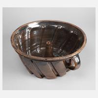 wohl Bunzlau, 19. Jh., ockerfarbener Feinsteinzeugscherben, handabgedreht, schwarzbraun verlaufende Glasur, zwei seitliche Bandhenkel,schräg gerippt, mehrere kleinere oberflächliche Bestoßungen, D 42 cm.