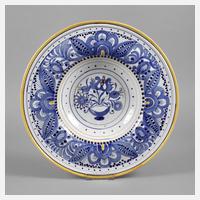 1930er Jahre, grüne Pinselmarke, Dekornummer 138, Steingut weiß glasiert, Pinseldekor in Kobaltblau und Gelb, bäuerlicher Dekor aus Blütenranken und Blütenschale im tief gemuldeten Spiegel, Wandaufhängung aus Draht, winzige Herstellungsfehler, sonst sehr guter Zustand, D 41 cm.