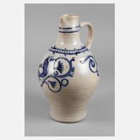 von größter Seltenheit, da die Manufaktur nur von 1807–1867 bestand, es sind nur ca. 30 Stück dieses Krugtyps nachgewiesen, graues Steinzeug handabgedreht, die Wandung schräg gekämmt, geritzt mit Signatur S, kobaltblaue Bemalung, schauseitig ein Hahn in floralen Ornamenten, am Hals ein Ornamentband und Rillenbänder, kleinere Herstellungsfehler, sonst guter unbeschädigter Zustand, H 40 cm.