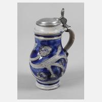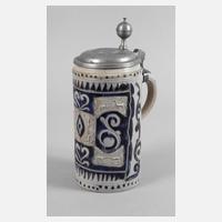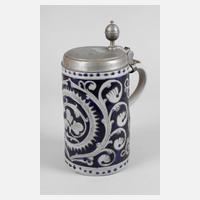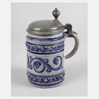 Damenkrüglein, um 1670, graues Steinzeug salzglasiert, geritzt und kobaltblau bemalt, Blattranken mit aufgemodelten Blüten, Zinndeckel mit Marke Martin Karl Höß Nürnberg, Meister ab 1671, guter altersgemäßer Zustand, selten, H 14 cm.
