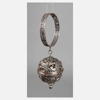 2. Hälfte 18. Jh., österreichischer Einfuhrstempel 1872–1902 mit Buchstabe A für Wien, Duftgefäß mit fein getriebenen und gravierten Rocaillenmotiven, scharniert, mit Druckmechanismus, abgehängte Kugel an Rosette, an einem Reifen als florales Band mit offener Monogrammkartusche, innen Reste alter Vergoldung, guter Zustand, L 21 cm, G ca. 82,5 g.