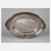 drei Silberpunzen A mit Krone für große Silberarbeiten, Jahreszeichen 1787 und Meisterpunze RPF, laut Klebeetikett Meister René Pierre Fournet?, ovale Platte mit geschweiftem Perlbandrand, fein ziselierte Blätter als Handhaben, auf der Fahne gravierte Blütenranken, eine offene Monogrammkartusche und eine mit Besitzermonogramm Keim, guter altersgemäßer Zustand, L 26 cm, G ca. 315,2 g.