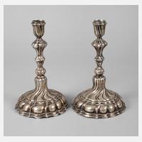 Mitte 18. Jh., gestempelter Buchstabe N, Tremulierstrich, undeutliche Herstellerpunze, gedreht gerippte Form, weiter Standfuß, hohl in den schlanken Balusterschaft übergehend, feststehende Tüllen, eine mit kleinem Einriss, sonst normale Altersspuren, H je 22 cm, G zusammen ca. 630 g.
