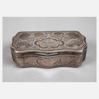Prag, um 1860, Silberstempel 13 Lot mit Buchstabe B, Herstellermonogramm M, geschweifte scharnierte Dose, allseitig fein graviert, auf dem Deckel Kartusche: ”Gratitude S.L.” zwei weitere offene Monogrammkartuschen, innen vergoldet, altersgemäß sehr guter Zustand, L 9 cm, G ca. 84,1 g.
