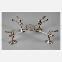 um 1818/19, verschiedene Punzen mit Lion Passant, Meisterpunzen Solomon Hougham, Solomon Royes & John East Dix, herausnehmbares Sieb mit durchbrochen gestaltetem Boden, der Rand mit Blüten reliefiert, Muschel als Drücker, Einsatz mit Resten alter Vergoldung, auf der Wandung graviertes Besitzermonogramm WEM, eine minimale Delle, sonst sehr schöner Erhaltungszustand, L 16,5 cm, G ca. 204 g.
