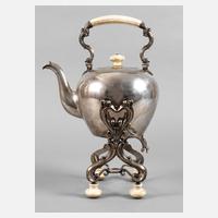 um 1880, gestempelter Dianakopf sowie M & K mit Krone, große gebauchte Kanne mit seitlich scharniertem Deckel und klappbarem, rocaillenverziertem Henkel, Griff, Knauf und Füße aus Elfenbein, Rechaud mit korrespondierendem Dekor, Brenner fehlt, Elfenbein etwas trocknungsrissig, Wandung minimal gedellt, Rechaud ebenfalls Silber geprüft, H mit Henkel 43 cm, G total ca. 1759 g.