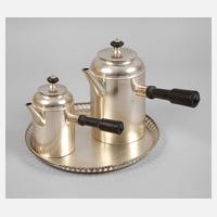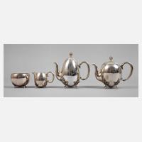um 1870, gestempelt 12 Lot, Berliner Hofjuweliermarke J. Wagner & Sohn, eiförmige und runde Gefäße, die Füße als Blätter gestaltet, Kannen mit rückseitig scharniertem Deckel und Zapfenknauf, Isolierscheiben aus Horn, ein Knauf etwas verdrückt, sonst guter altersgemäßer Zustand, H max. 17 cm, G total ca. 768,1 g.