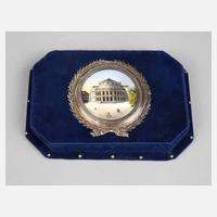 datiert 1877, gewölbte Porzellanbildplatte mit feiner Bemalung, Darstellung des ersten Semperbaus, der 1869 durch einen Brand vernichtet wurde, in silbernem Blattkranz mit Schleifenband, als Briefbeschwerer, montiert auf einen samtbezogenen Steinsockel?, normale Altersspuren, L 17 cm.