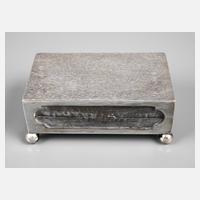 um 1930, gestempelt Halbmond, Krone, 800, unleserliche Herstellermarke ”uf”?, auf vier Kugelfüßen stehend, schauseitig fein ziseliert, graviertes ligiertes Besitzermonogramm mit Königskrone, eingeschobene Streichholzschachtel, darauf Abbildung der Karlsruher Wasserspiele, L 12 cm, G ca. 160 g.