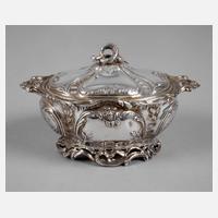 um 1880, gestempelter Minervakopf, Herstellerpunze Meistermarke Roussel Fils et Cie/Paris, ovale Form mit abnehmbarem Deckel, reich verziert mit Maskaronen, Rocaillenmotiven, Muscheln und Schlange als Deckelknauf, innen Reste alter Vergoldung, an den Rändern etwas gedellt, sonst normale Altersspuren, L 15 cm, G ca. 240,7 g.